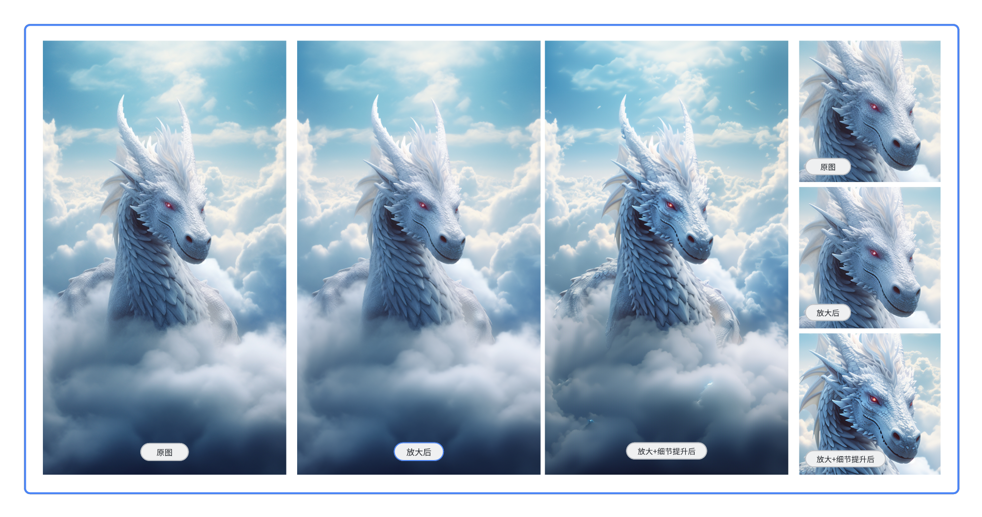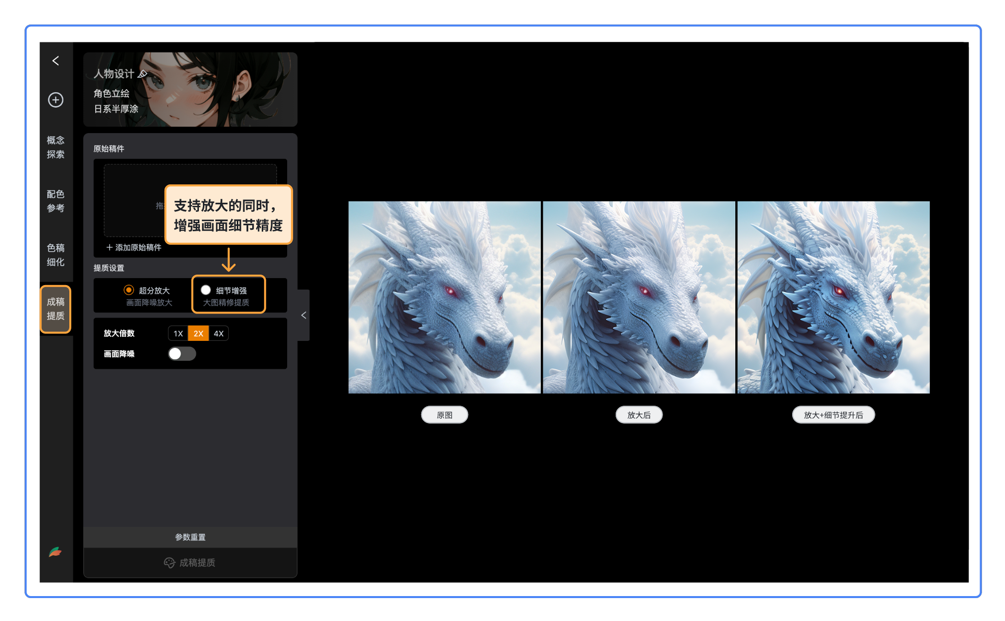 1)如放大的同时,需要画面精度也同步提升,需选择细节增加,再选择放大比例。