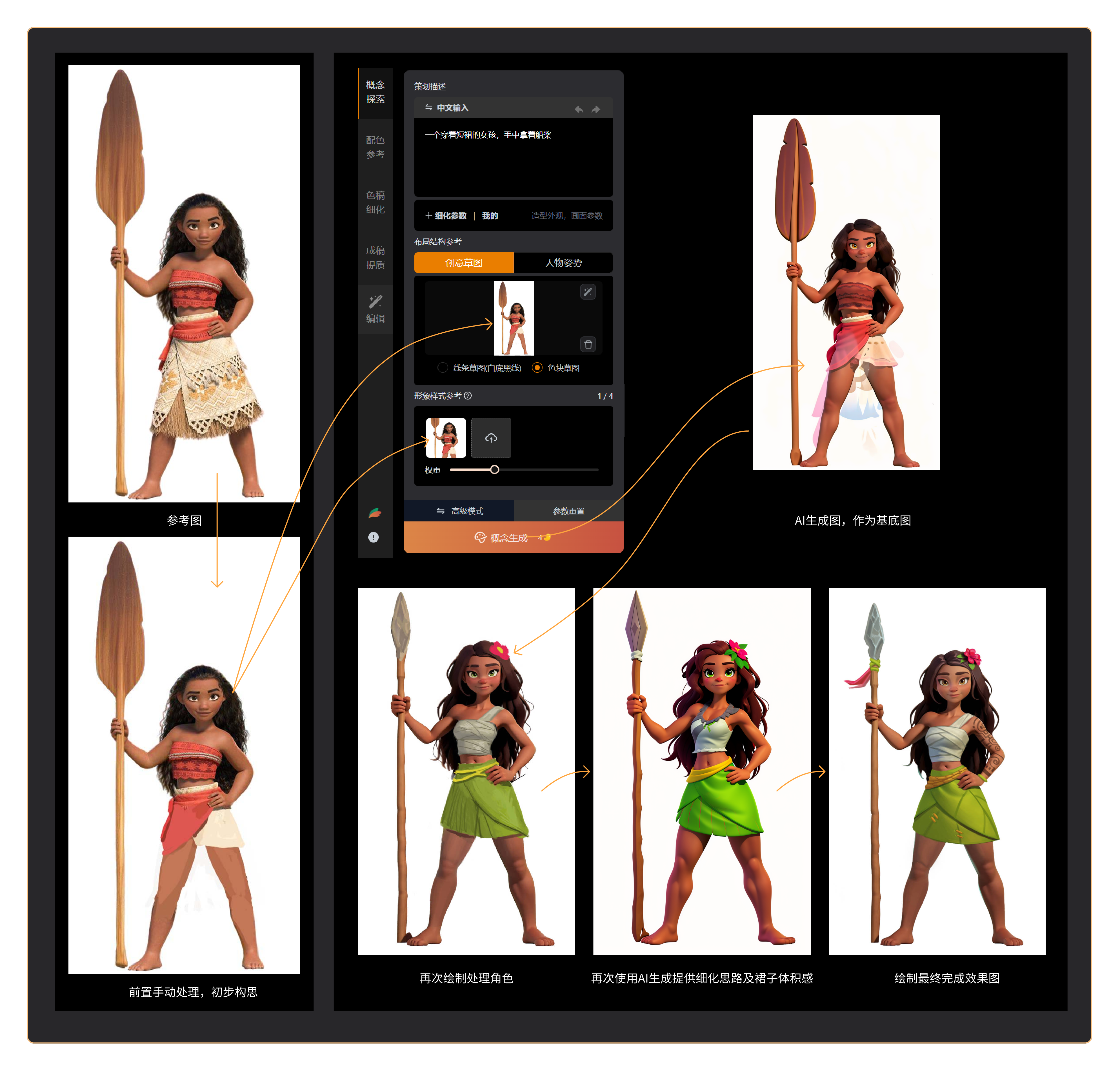 该角色的制作思路与上述基本一致,设计师先使用AI辅助完成角色轮廓+光影和配色效果,不同的点在于,设计师前置处理了参考图,先框定的角色造型,再将不需要的纹身的元素抹除,减少后期对生成图的修改。