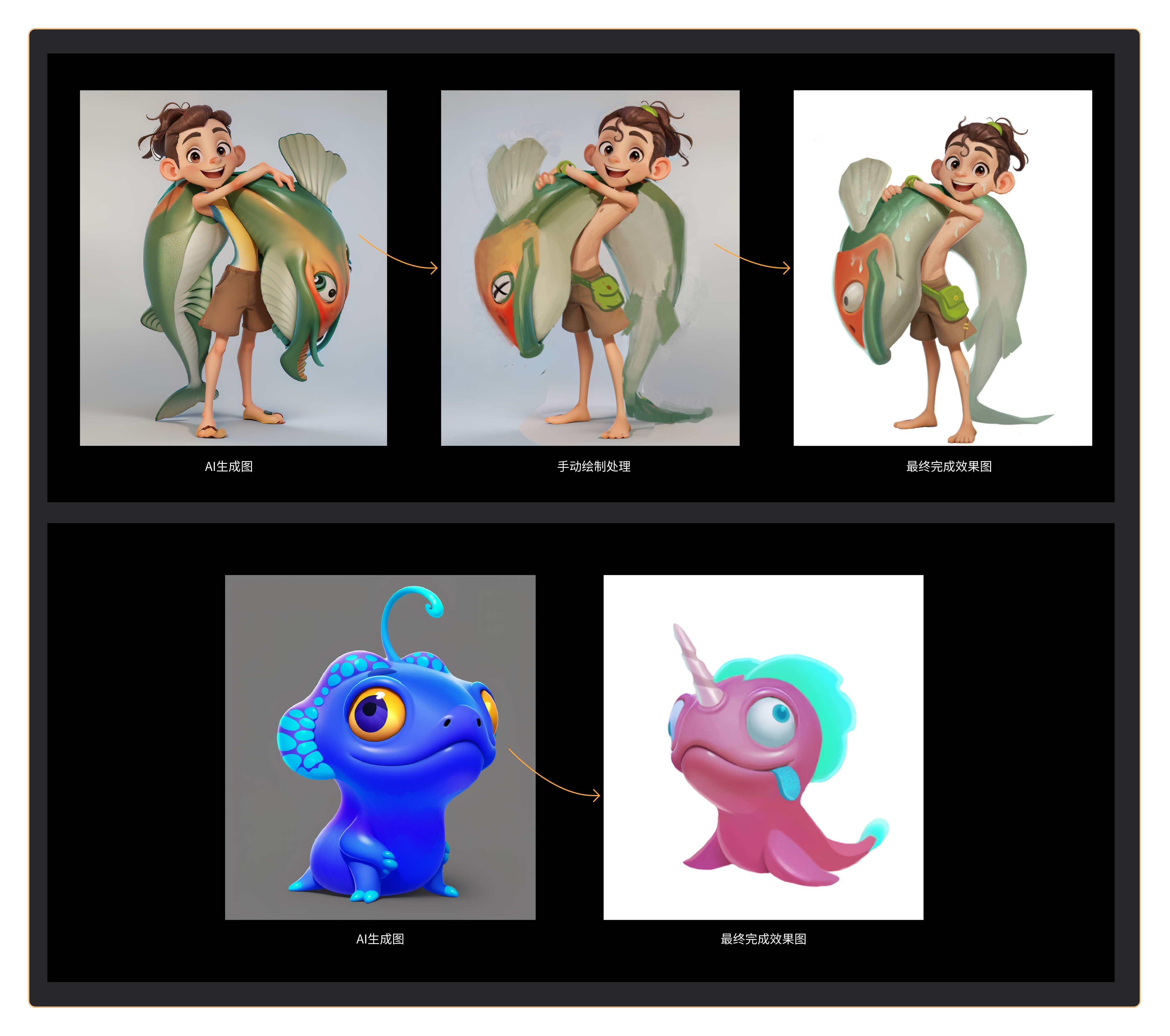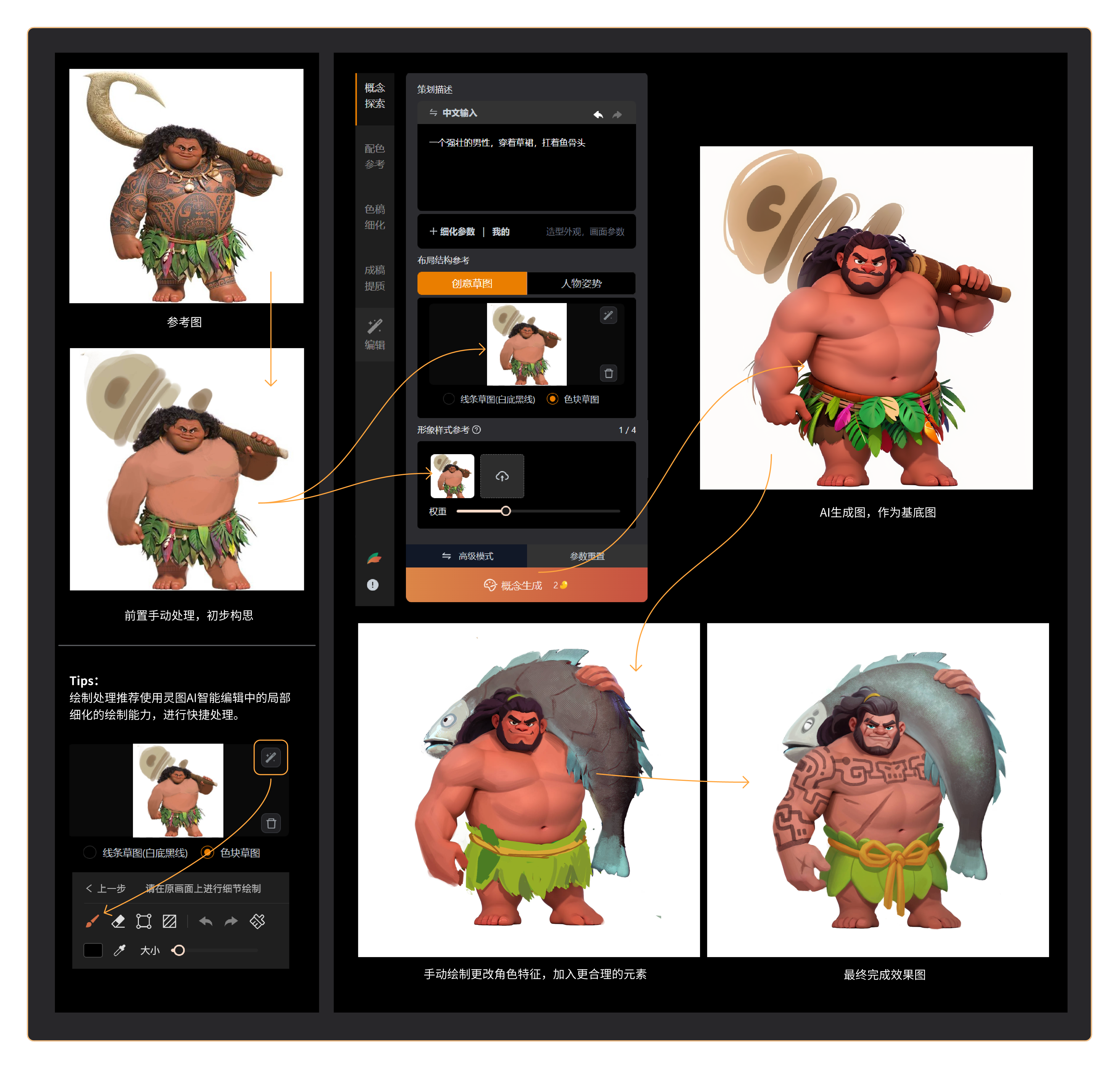 从上图我们可以看到,设计师使用灵图AI确定角色轮廓后,发现原设想的鱼骨头道具不太符合设定。于是在AI生成的角色基底图的上进行了再创作,将原先不符合设定的道具进行修改,重新绘制了鱼的元素。AI在此过程中,不仅快速提供了基础轮廓图,也同时对设计师的设想进行了验证,方便设计师快速确认方案的可行性。