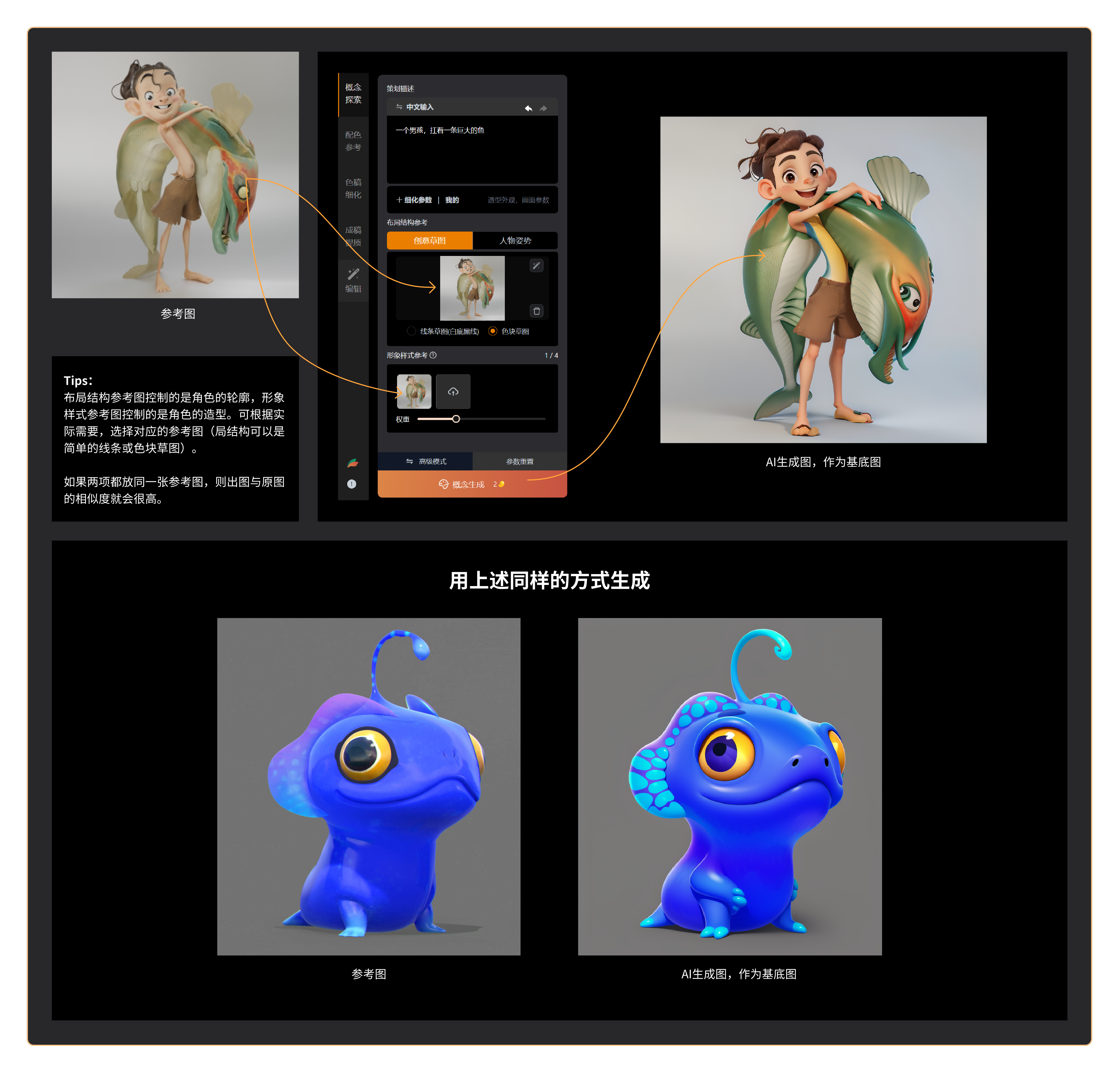1)分别上传意向参考图至【结构草图】和【形象参考】区域;