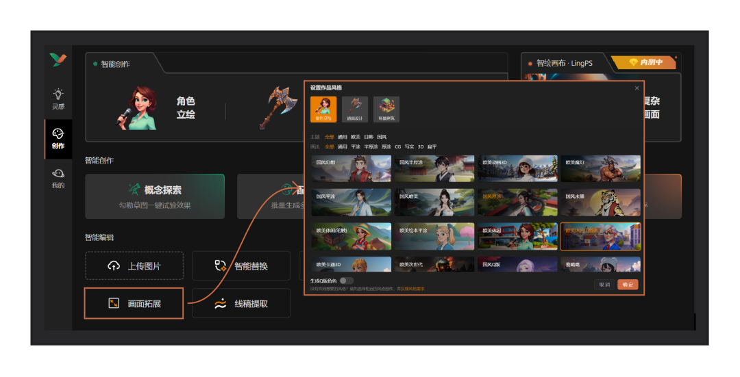 1)进入灵图AI工作台,在【创作】-【智能编辑】,点击进入“画面拓展”,选择与图片相符的风格;
